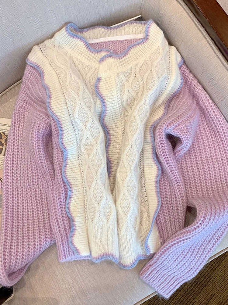 紫色毛衣外套女2021秋季新款拼色温柔甜美慵懒风小众设计针织开衫热门设计联盟服务商