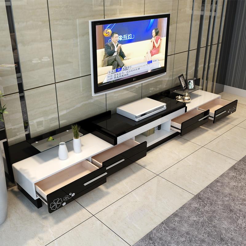 简约黑白伸缩电视柜茶几组合钢化玻璃影视柜大户型超长电视柜。热门设计联盟服务商
